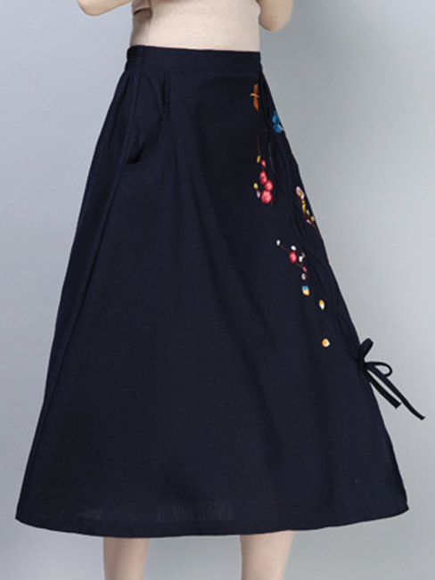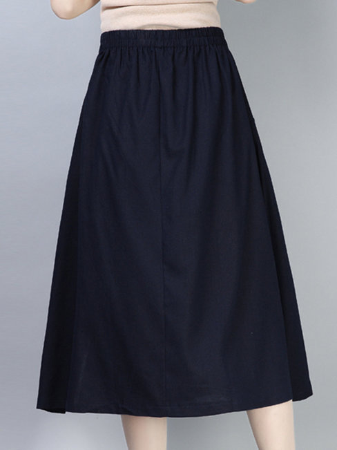 Navy Blue Mid-Calf A-line Pattern Linen Plain Skirt (Style V101831)