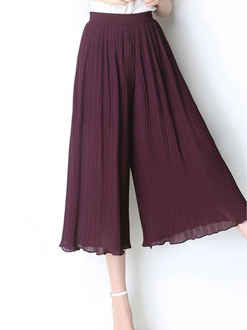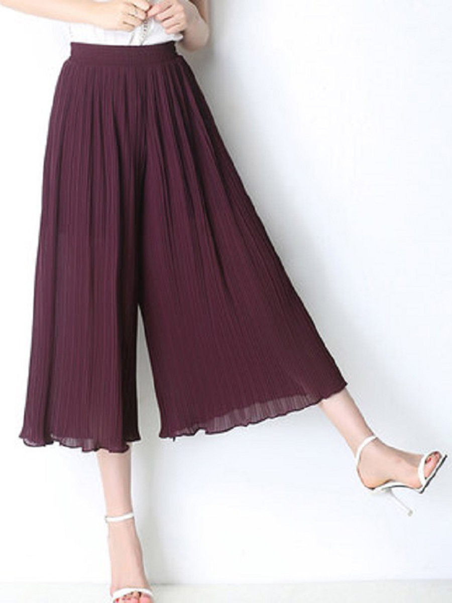 - Wine Mid-Calf Loose Slow Life Polyester Plain Pants (Style V102382)