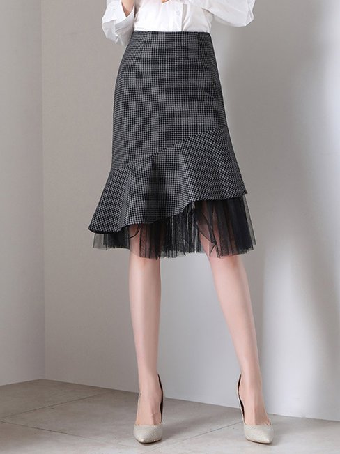- Black Mid-Calf Mermaid Ruffle Polyester Plaid Skirt (Style V101843)