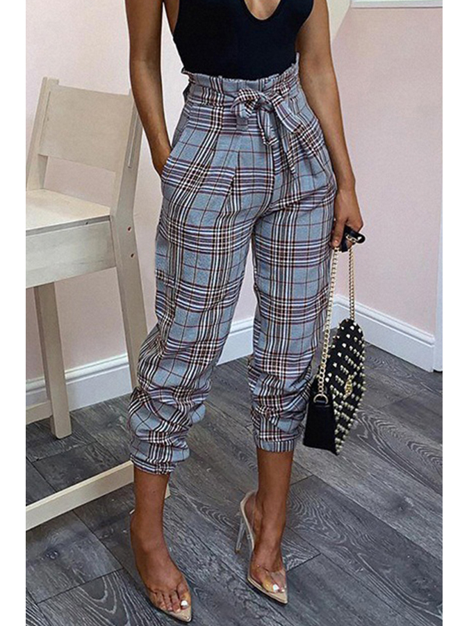 Blue Mid-Calf Slim Office Belt Plaid Pants (Style V102116)