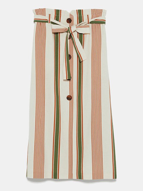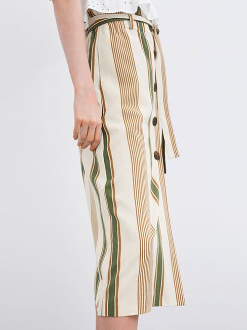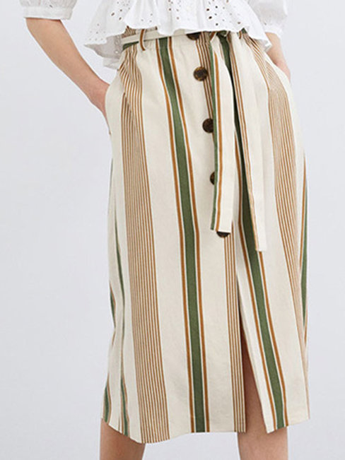 White Mid-Calf Slow Life Belt Polyester Striped Skirt (Style V101863)