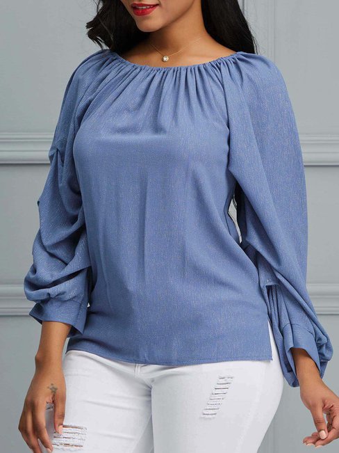 Blue Midi Loose Plain Chiffon Patchwork Blouse (Style V200604)