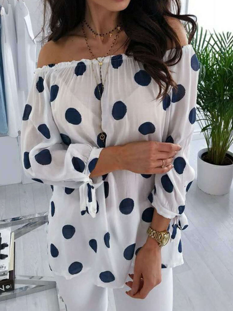 White Midi Loose Polka Dot Chiffon Pattern Blouse (Style V201497)