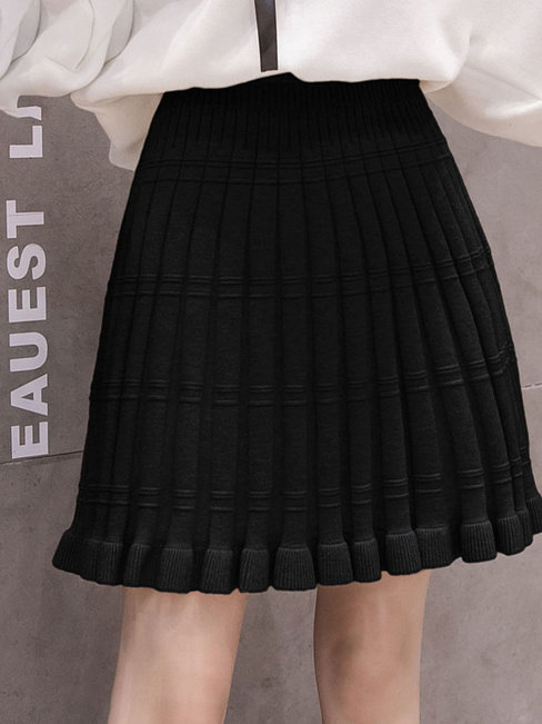 Black Mini Pleated Elegant Knitted Plain Skirt (Style V201888)
