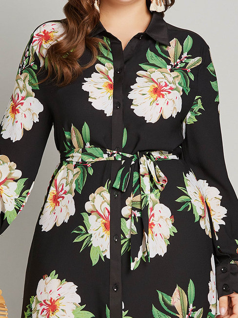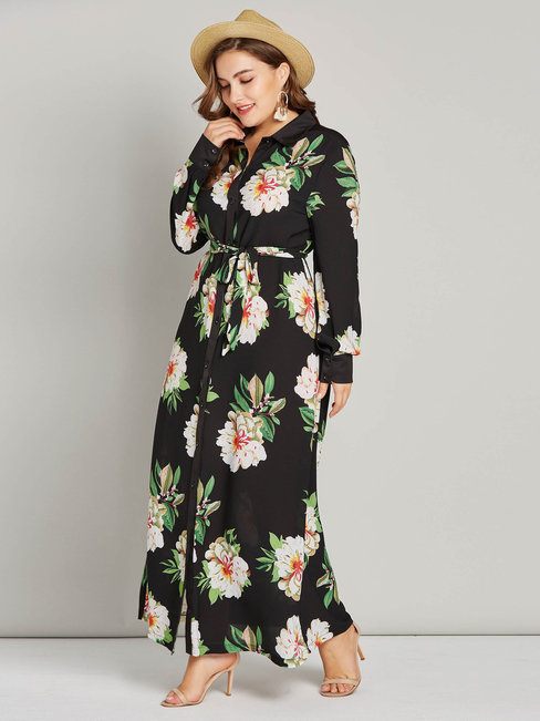 - Black Muslim Expansion Lapel Floral Polyester Maxi Dresses (Style V200876)