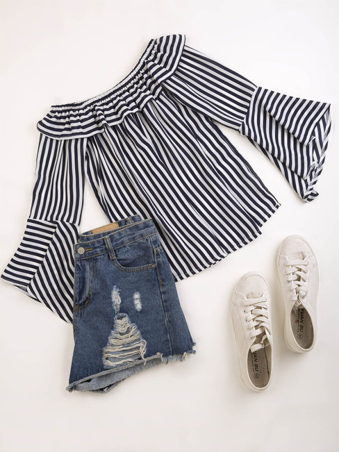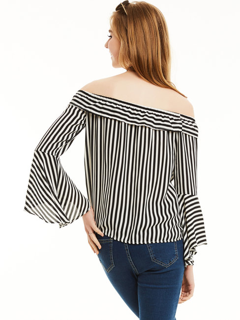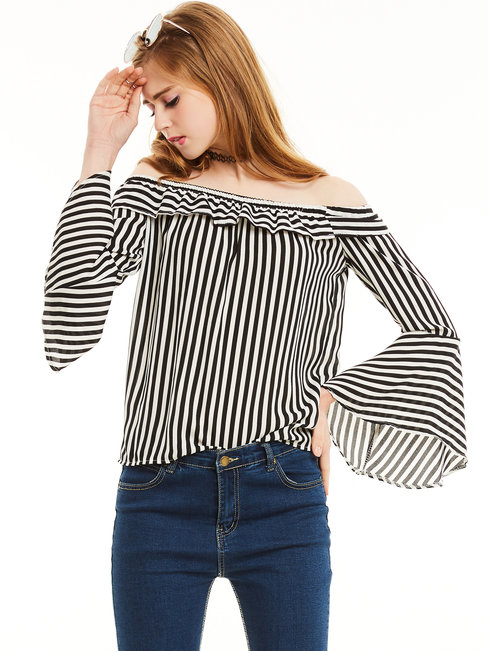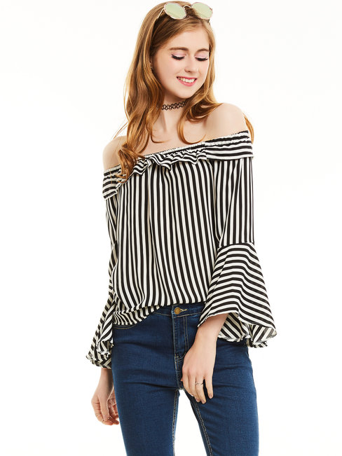 - Black Off The Shoulder Standard Date Night Polyester Ruffle Blouse (Style V201620)