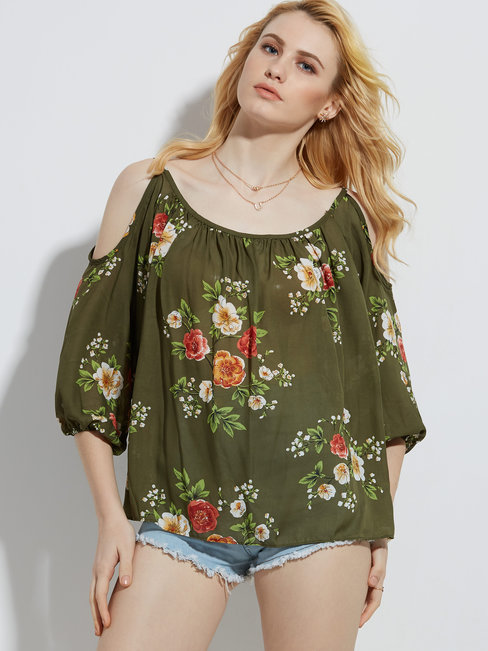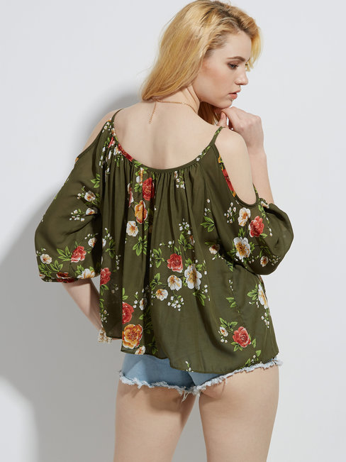 Green Off The Shoulder Standard Loose Floral Pattern Blouse (Style V200108)