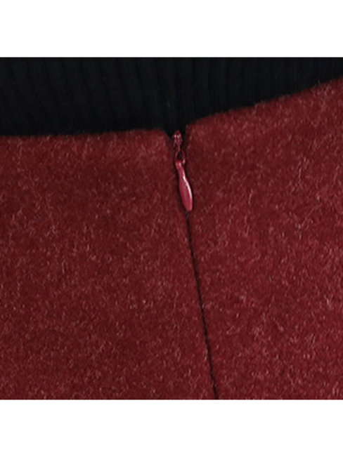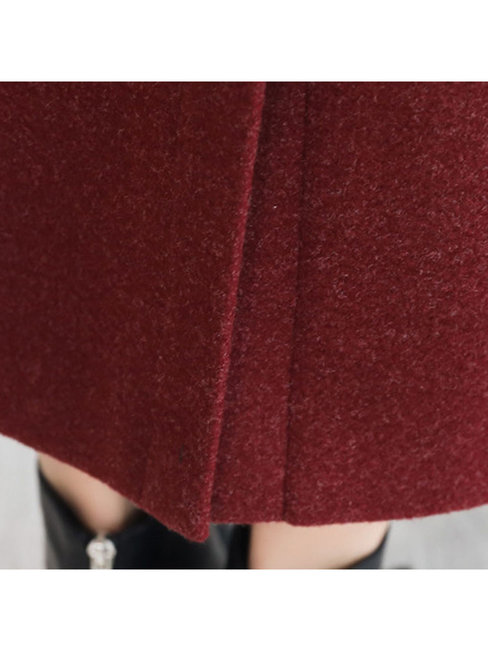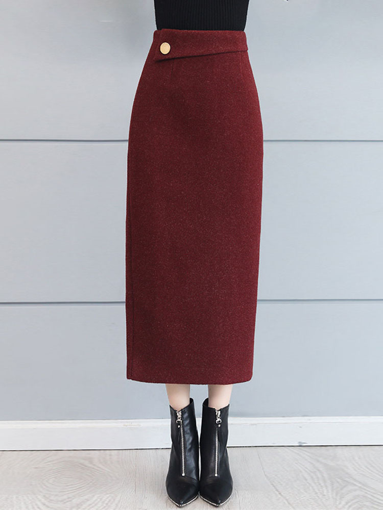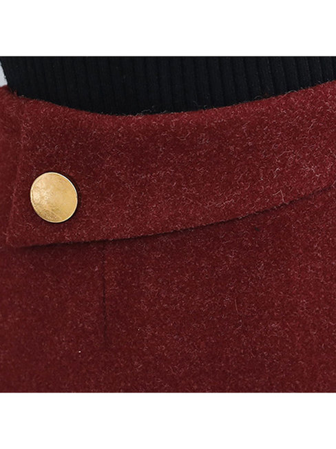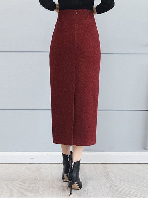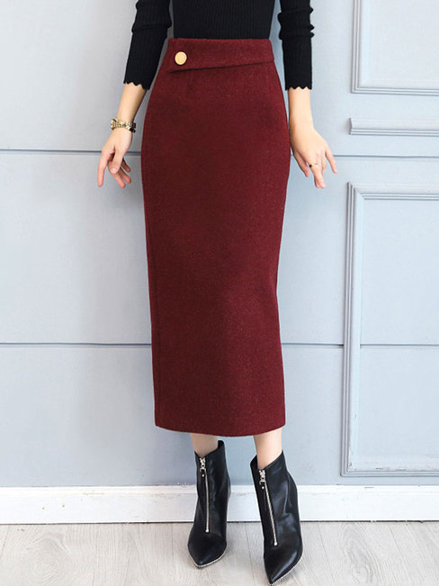 Burgundy Pencil Elegant Button Polyester Plain Skirt (Style V201892)