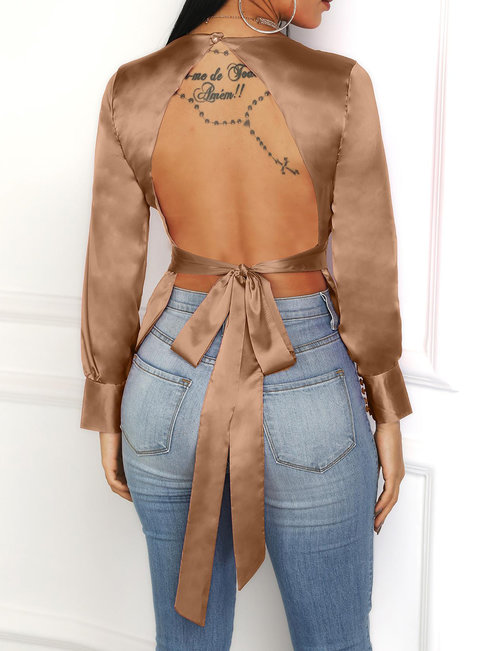 - Brown Round Neck Date Night Plain Polyester Backless Blouse (Style V300266)