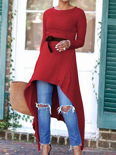 - Red Round Neck Long Slim Plain Asymmetrical T Shirt (Style V200280)