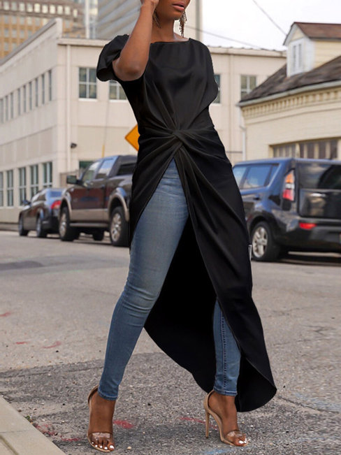 - Black Round Neck Long Western Polyester Asymmetrical Blouse (Style V201535)