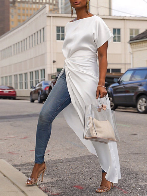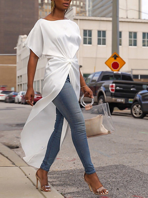 White Round Neck Long Western Polyester Asymmetrical Blouse (Style V201535)
