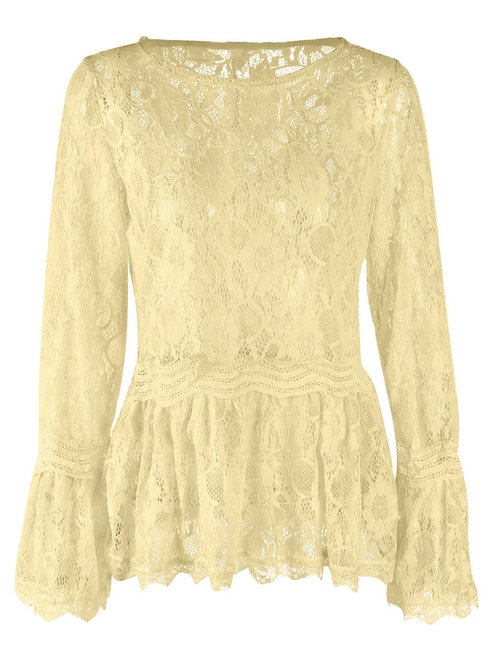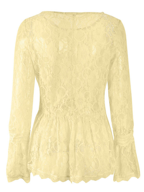 - Yellow Round Neck Midi Slim Plain Lace Blouse (Style V200795)
