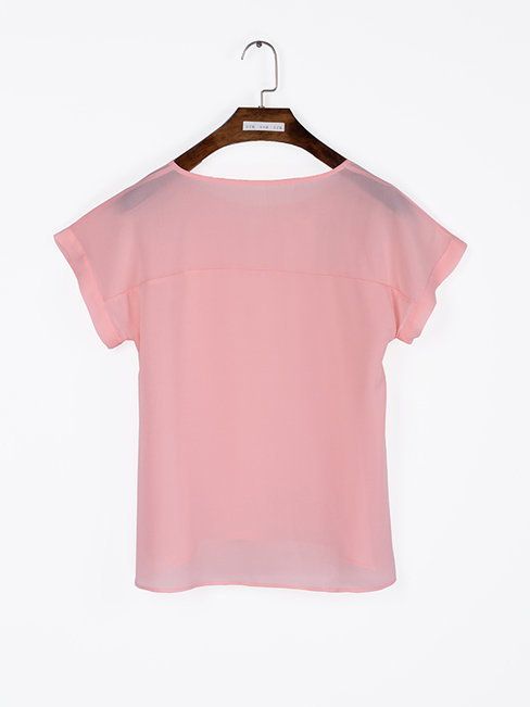 - Light Pink Round Neck Short Slim Plain Chiffon Blouse (Style V201747)