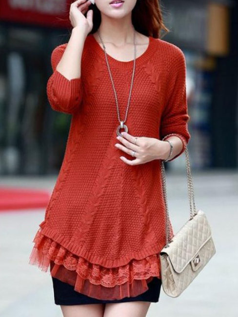 Black Round Neck Slim Plain Lace Lace Sweater (Style V101064)