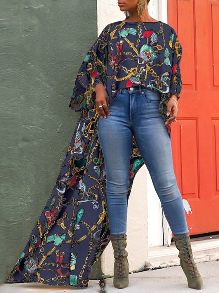 - Dark Blue Round Neck Slim Tribal Polyester Asymmetrical Blouse (Style V201536)
