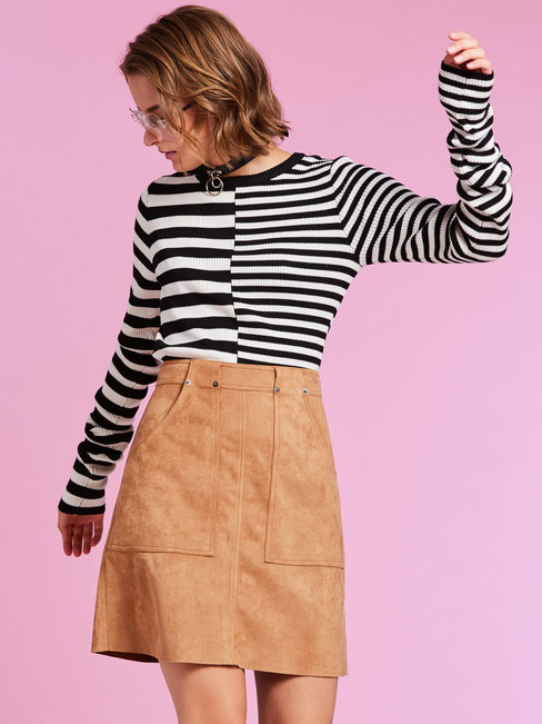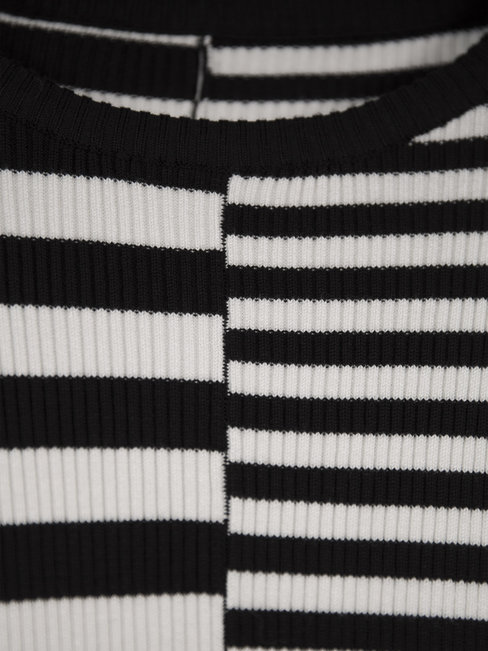 The asymmetric striped pattern is unique. Its slim sweater is comfortable and flatters my figure. Will order a coat from here for winter next time.