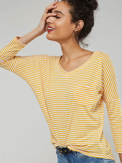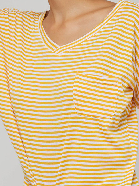 - Yellow Round Neck Standard Slim Sweet Striped T Shirt (Style V200955)