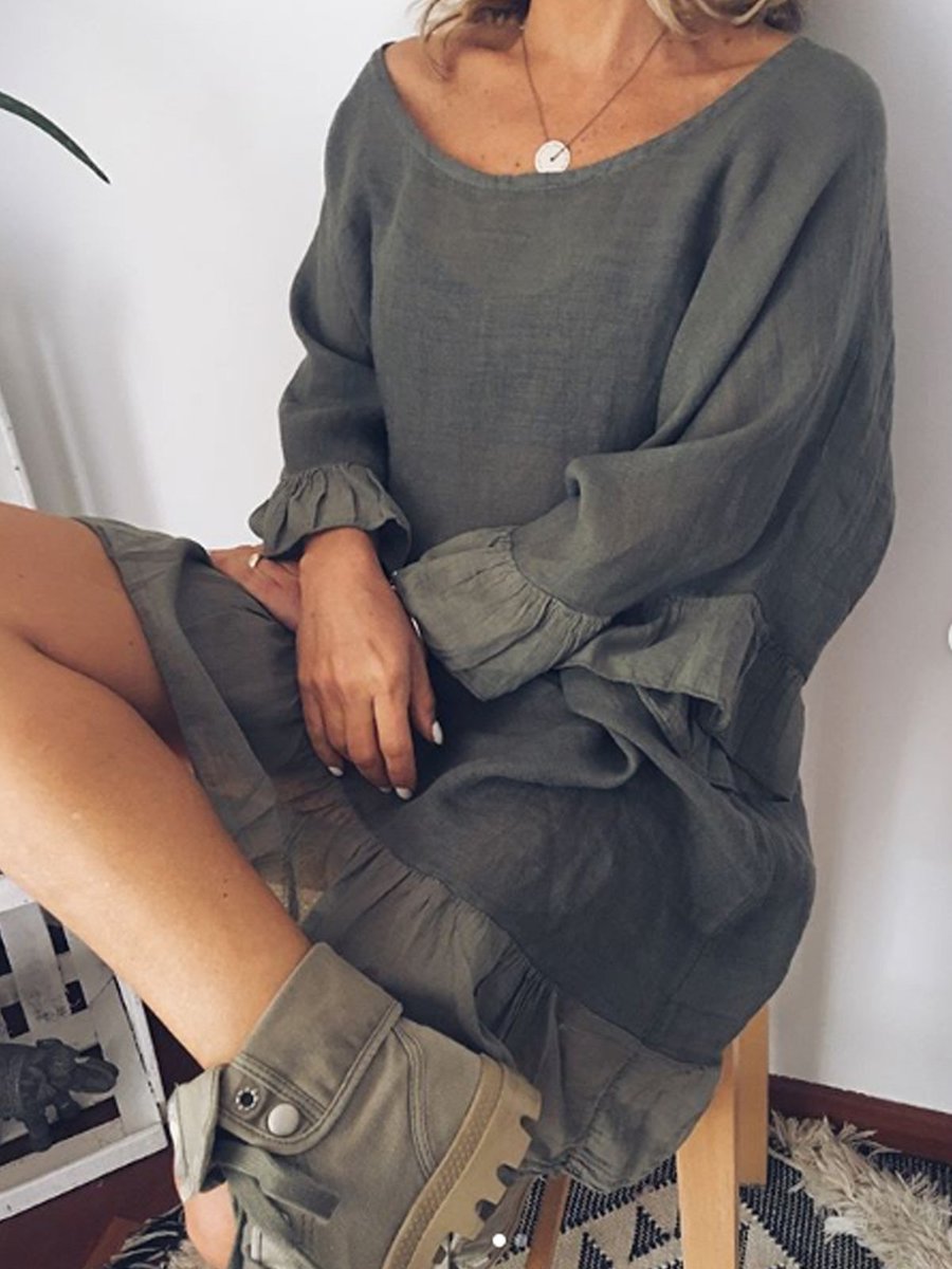 Grey Sexy Boat Neck Solid Color Ruffle Cotton Blends Casual Dresses (Style V100328)