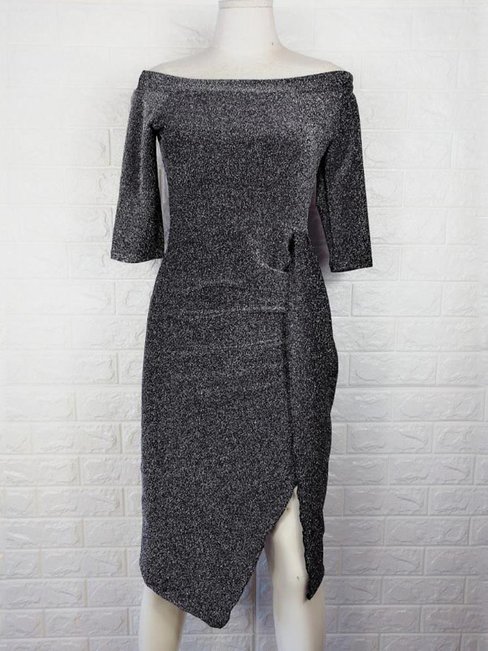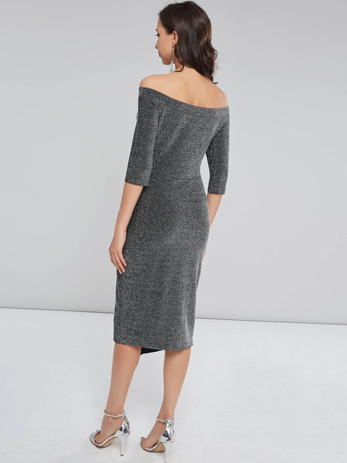 - Silver Sexy Bodycon Off The Shoulder Plain Ruffle Knee Length Dresses (Style V200962)