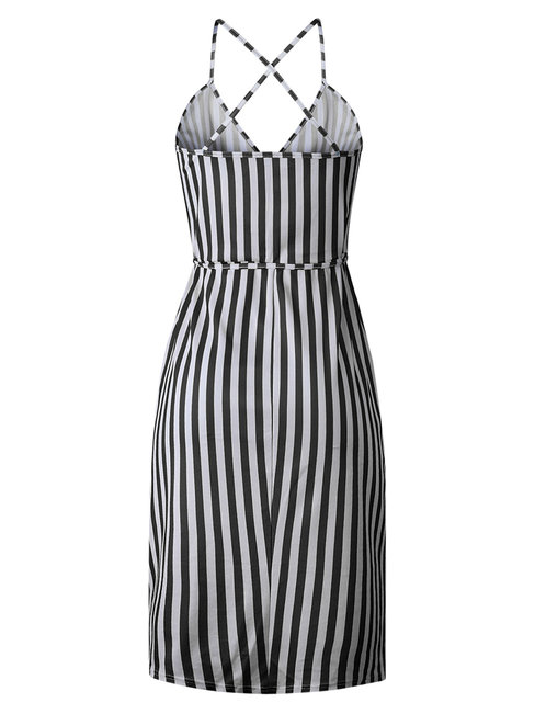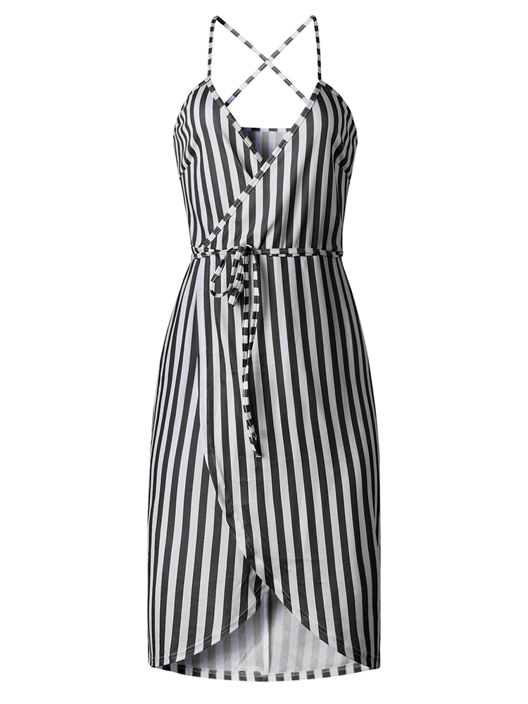 - Black Sexy Bodycon Spaghetti Strap Striped Asymmetrical Knee Length Dresses (Style V200728)