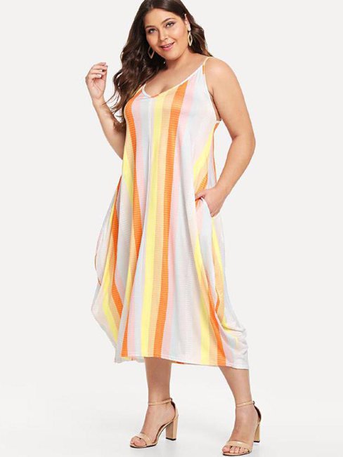Yellow Sexy Expansion Striped Print Polyester Midi Dresses (Style V201384)
