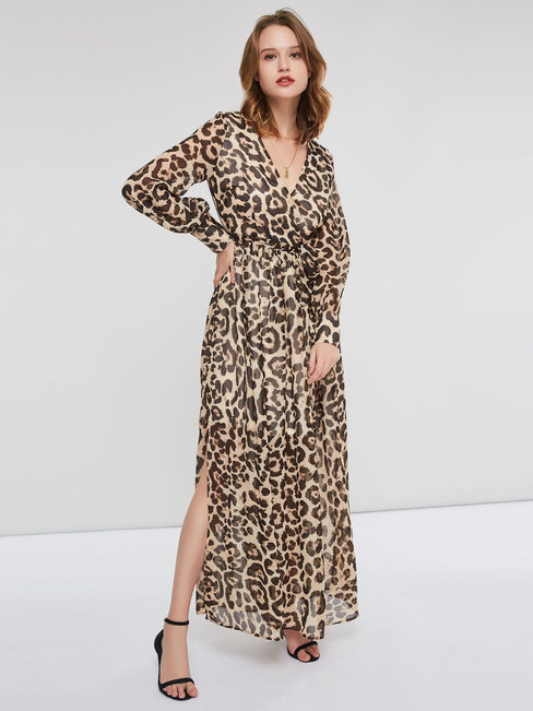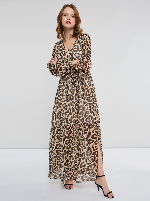 Light Brown Sexy V-neck Leopard Print Chiffon Maxi Dresses (Style V200994)