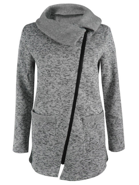 - Grey Shawl Collar Long Casual Plain Zipper Hoodie (Style V100689)