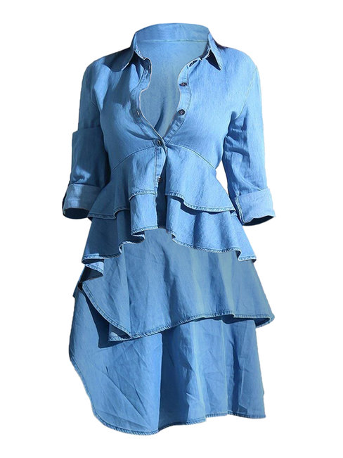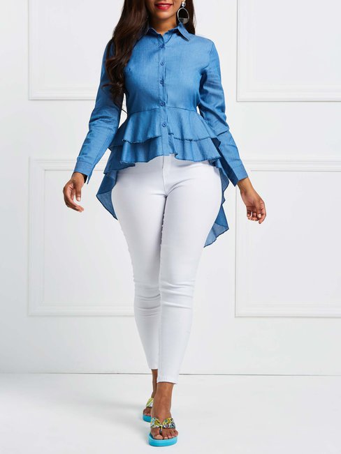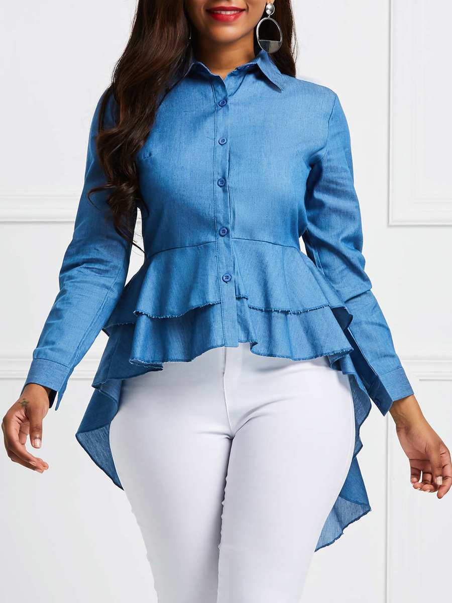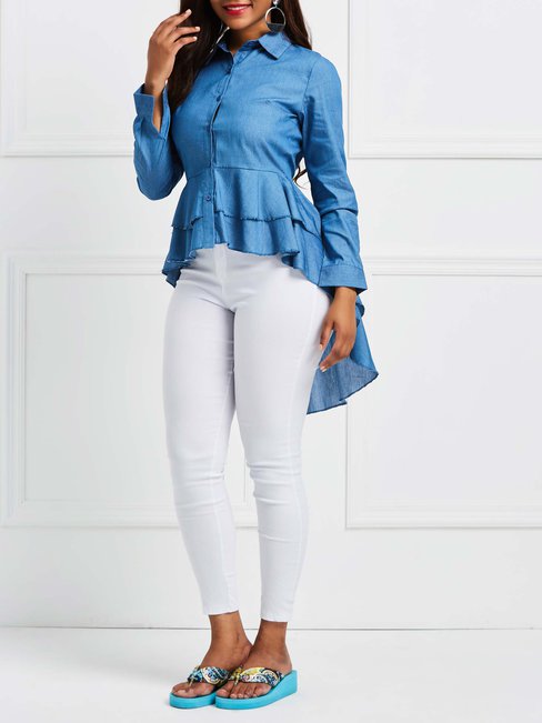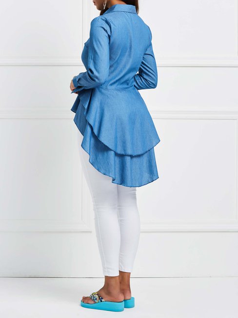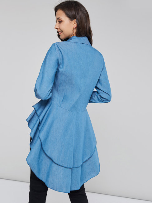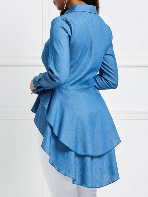 - Denim Blue Shawl Collar Long Plain Polyester Asymmetrical Blouse (Style V200518)