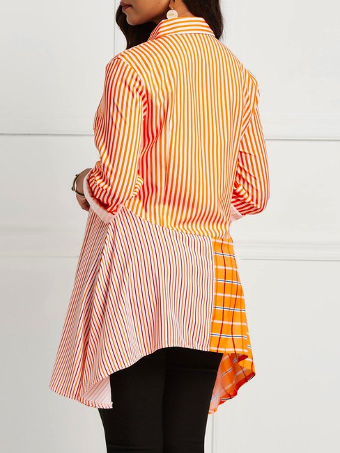 - Orange Shawl Collar Loose Casual Striped Patchwork Blouse (Style V201035)