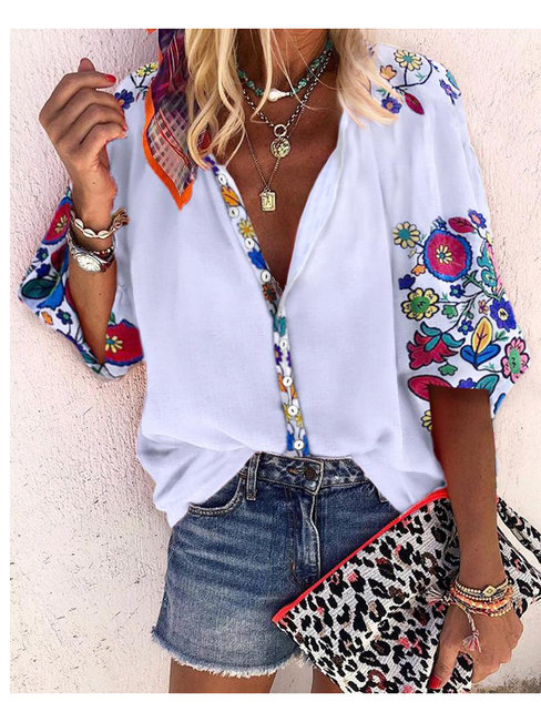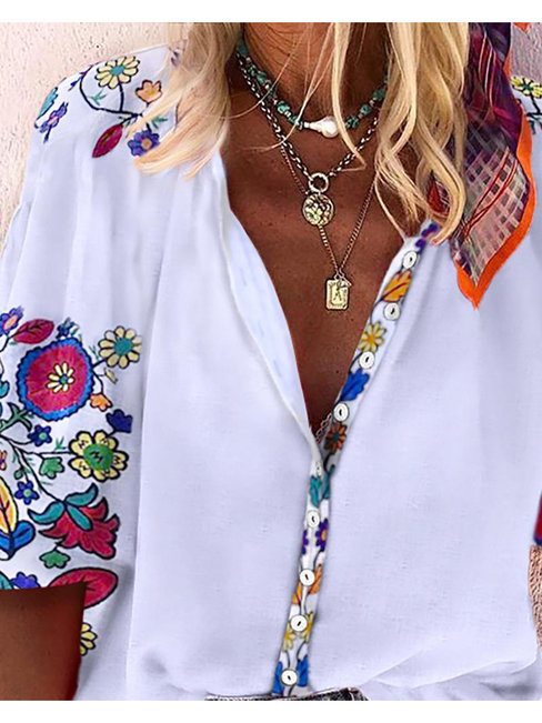 - White Shawl Collar Loose Fashion Plants Pattern Blouse (Style V300753)