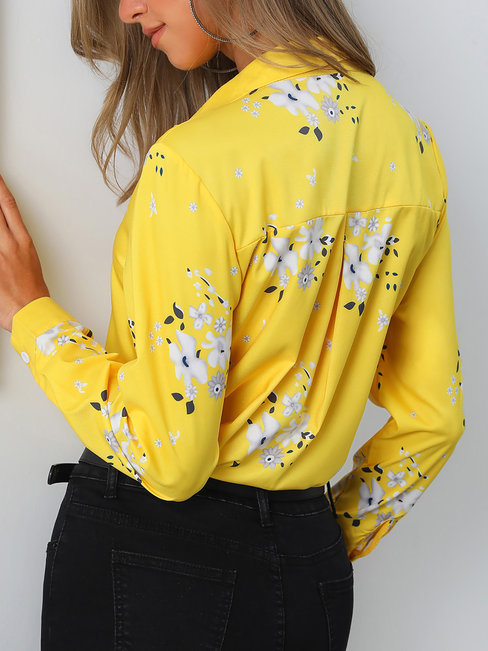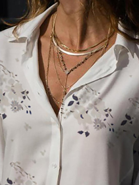 - White Shirt Collar Date Night Floral Polyester Button Blouse (Style V300826)