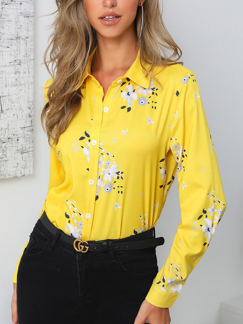 Yellow Shirt Collar Date Night Floral Polyester Button Blouse (Style V300826)