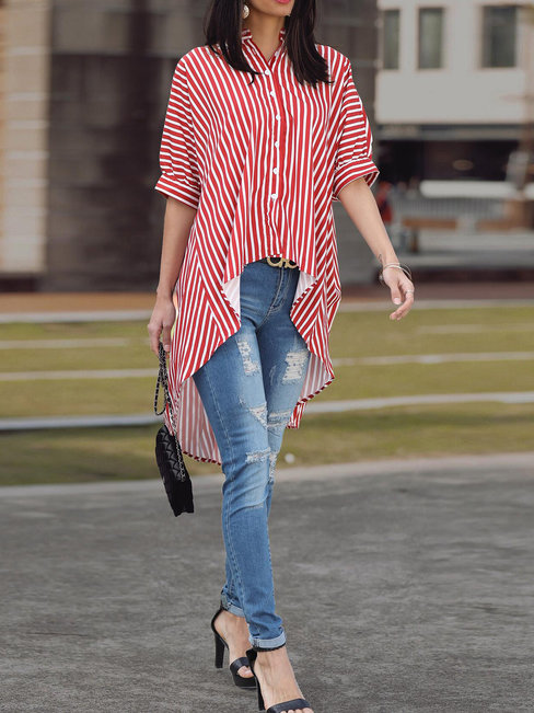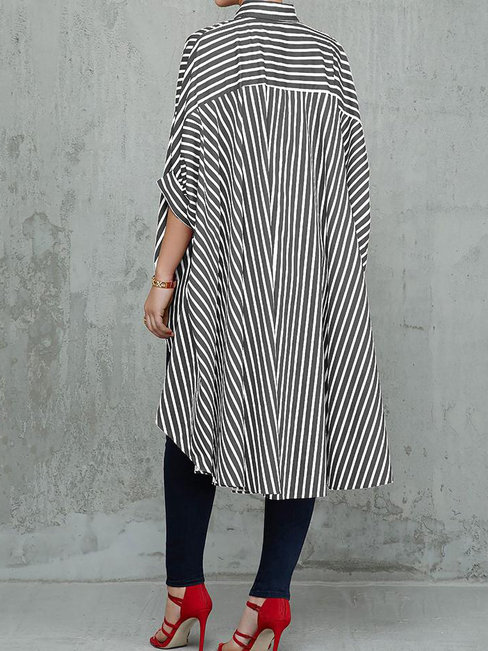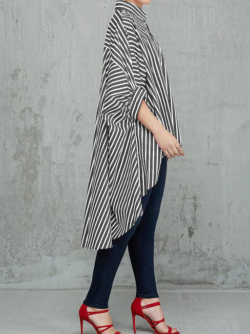 - Gray Shirt Collar Loose Date Night Striped Asymmetrical Blouse (Style V300014)