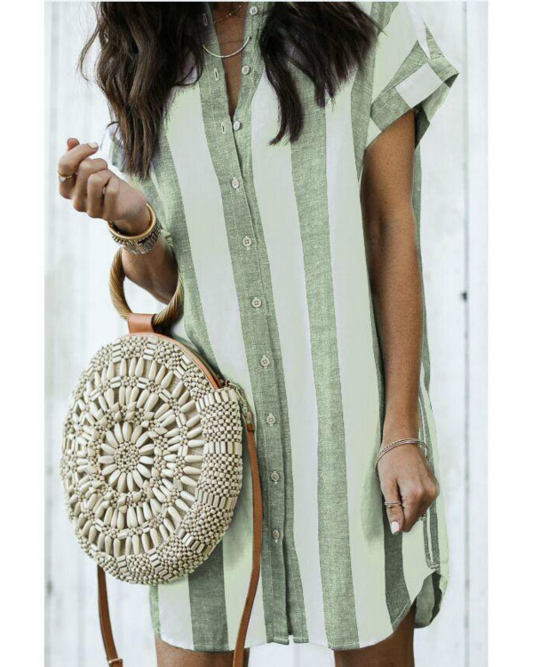 Green Shirt V-neck Striped Pattern Polyester Casual Dresses (Style V100554)