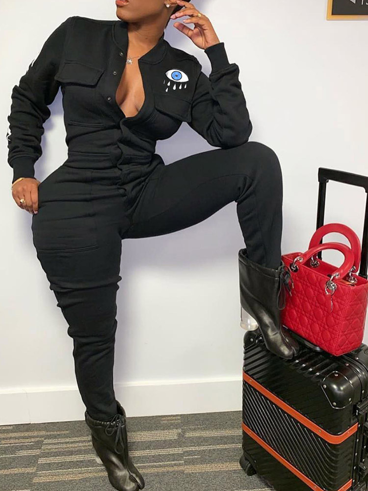 - Black Slim Casual Cartoon Cotton Blends Pattern Jumpsuit (Style V201349)