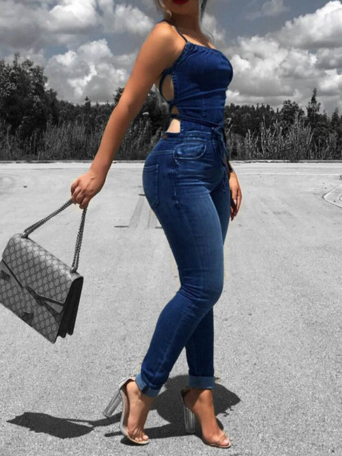 - Blue Slim Casual Plain Denim Backless Jumpsuit (Style V201333)