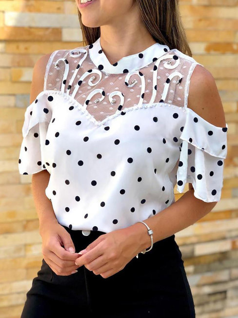 - White Stand Collar Loose Elegant Dacron Pattern Blouse (Style V300361)