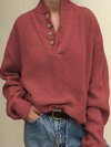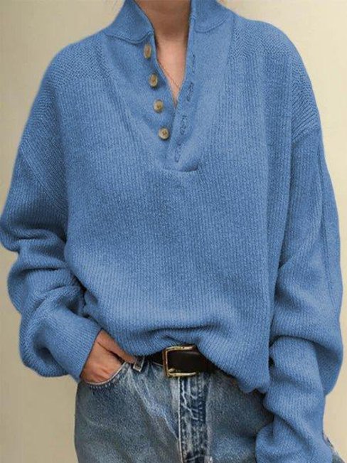 - Blue Stand Collar Loose Fashion Plain Button Sweater (Style V102497)