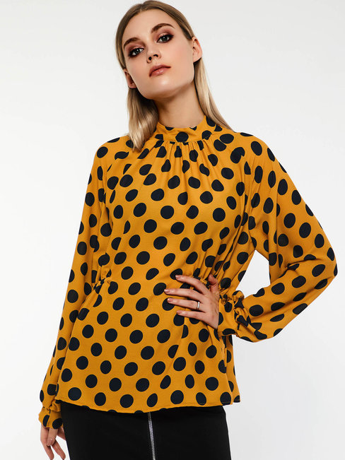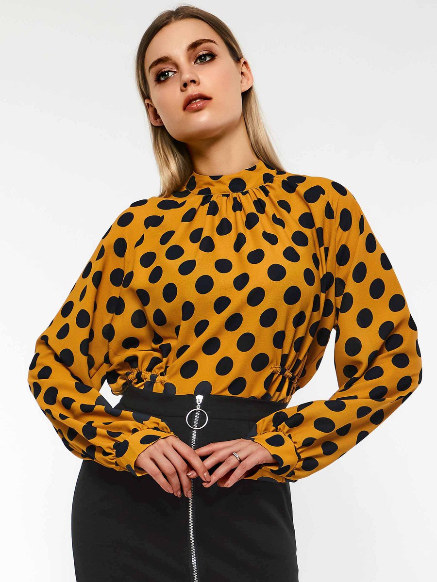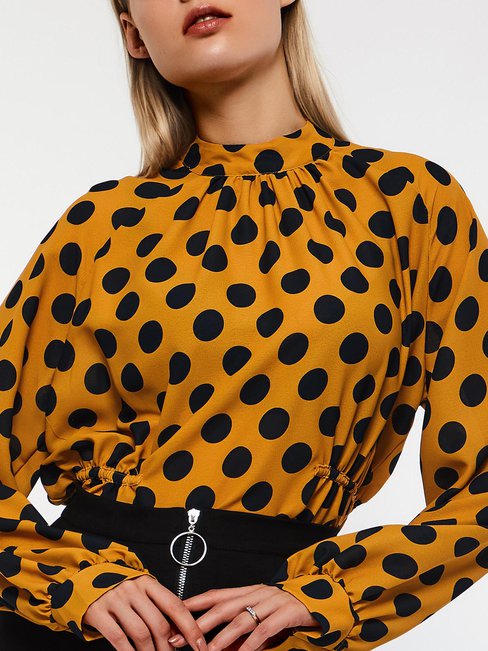- Yellow Stand Collar Midi Loose Casual Color Block Blouse (Style V201099)