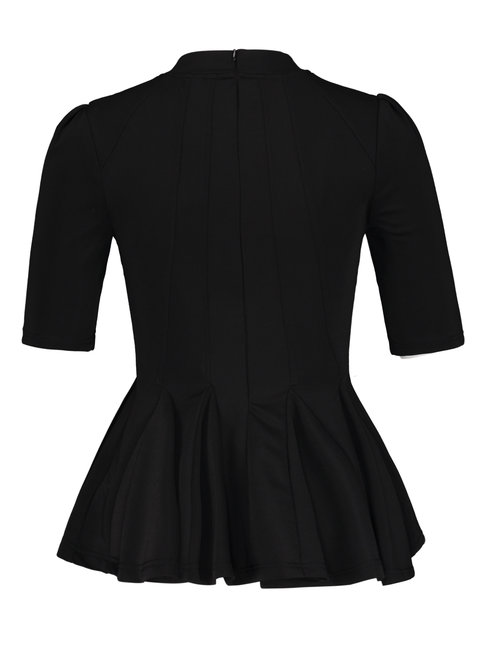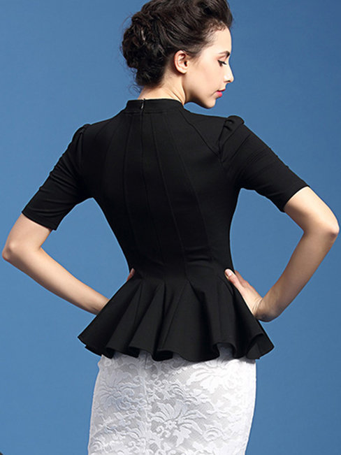 - Black Stand Collar Slim Plain Polyester Cascading Ruffle Blouse (Style V200228)