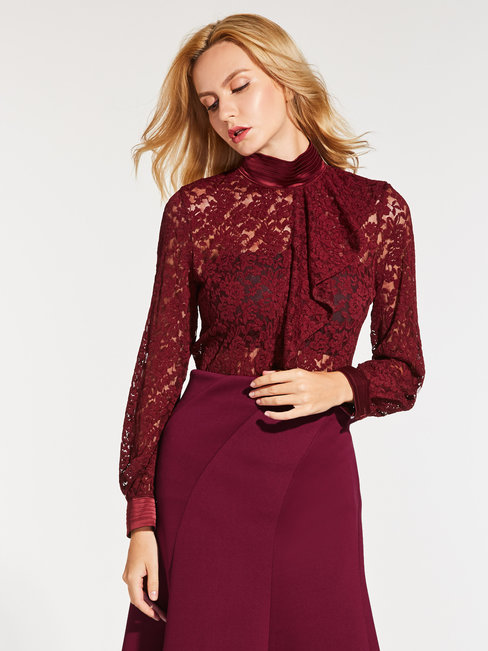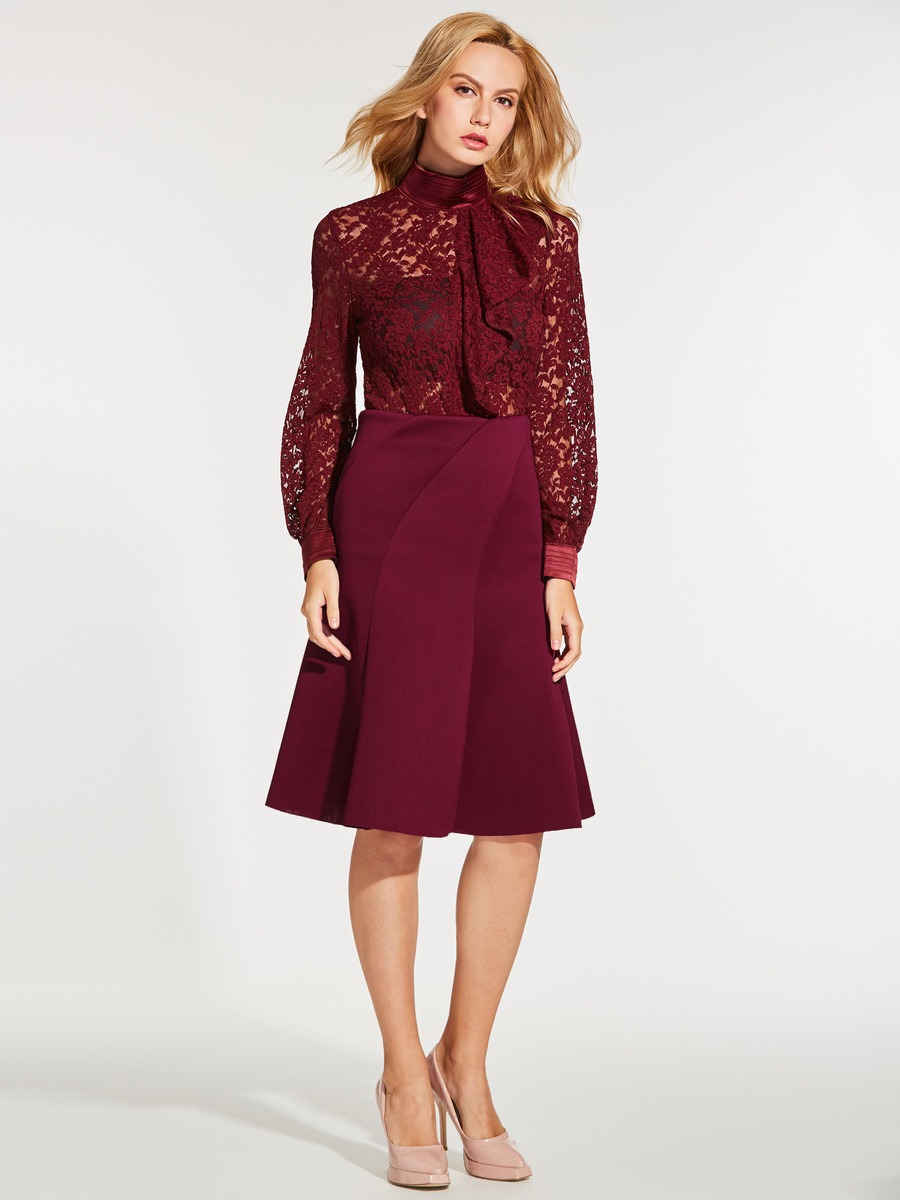 - Dark Red Stand Collar Standard Office Plain See-Through Blouse (Style V201686)