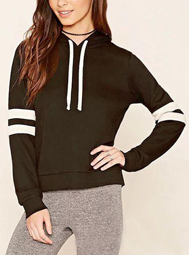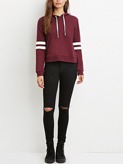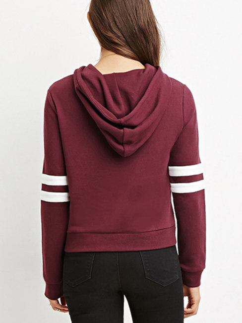 This short designed sweatershirt looks simple and sporty. The cotton material's comfortable, and the stripes at the sleeves are chic. It's a good casual wear!