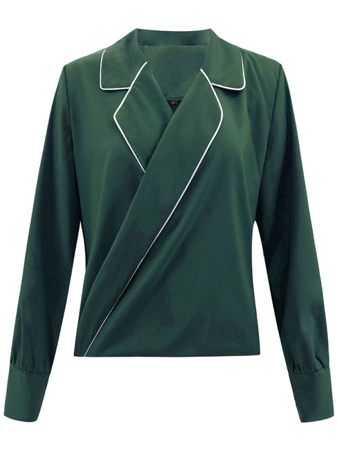 This blouse looks elegant and very chic! The folding collar and the V neck design's very fine made. The tailorship's great! Will buy again!