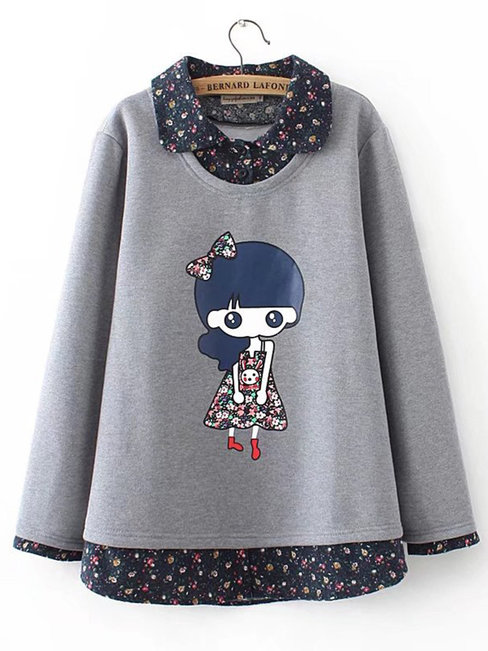 - Grey Standard Loose Floral Cotton Pattern Sweatshirts (Style V100647)