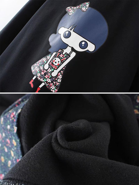 The cartoon girl pattern's very cute! And the mini floral pattern looks lovely. Basic design's a casual style, love it very much!