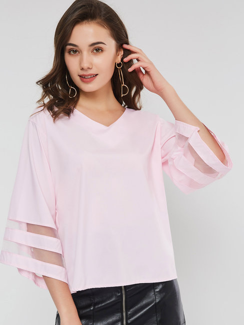 - Pink Standard Loose Plain Cotton Patchwork Blouse (Style V201025)