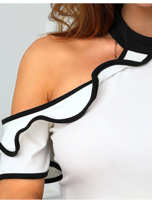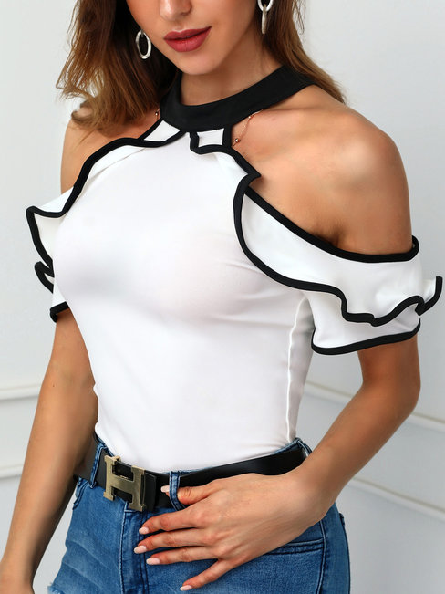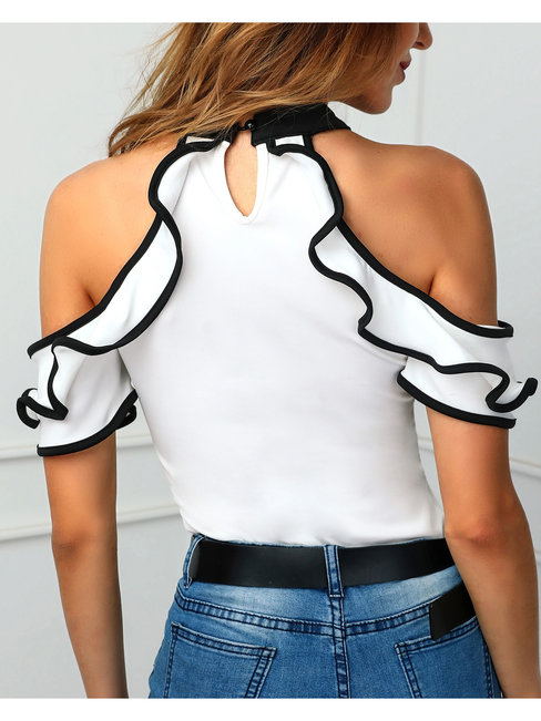 Cute ruffles and cold shoulder design! This T shirt looks lovely and its slim contour pairs perfect with short pants! Love this T shirt!