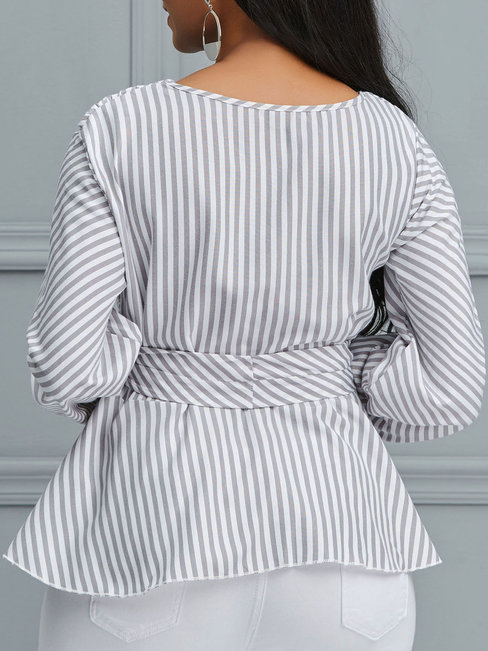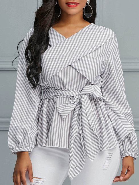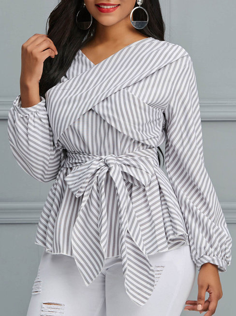 - White Standard Slim England Striped Patchwork Blouse (Style V200667)
