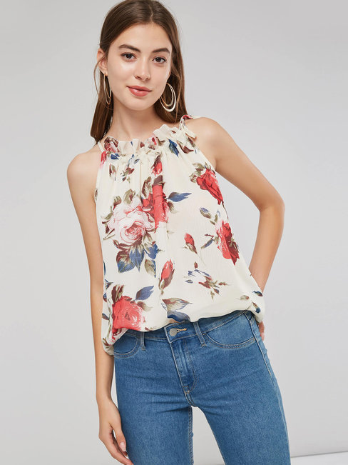 - Light Apricot Standard Slim Floral Chiffon Pattern Tank Top (Style V200037)